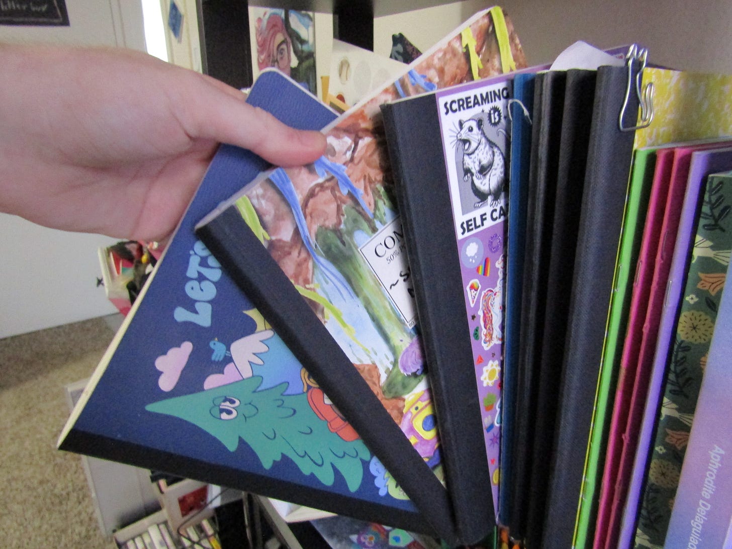 Besides being particular about my notebooks, I don’t abide by a lot of other strict rituals. Often, I write at my desk with the cat in my hoodie, burning incense and listening to old tapes. Sometimes (rarely) I will use prompts or work through writing advice books. I take my notebooks to the nature park and library and cafes and friends’ houses. I flip through my old notebooks and look for ideas or reference notes, but I don’t really sit down and reread them. But maybe I’ll talk about how I go from prewriting to draft a different day.